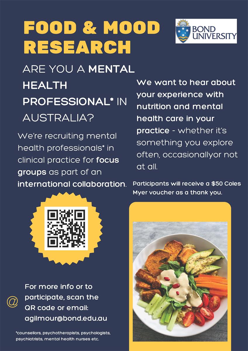 Researchers at Bond University are conducting a research study to explore how mental health professionals integrate nutrition in clinical practice – if this is something you do often, rarely or not at all. Your perspectives can help shape evidence-based recommendations for practice and education, as part of an international collaboration spanning Europe, Australasia, and North America.